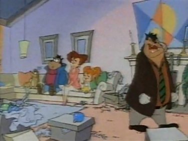 The next morning, being buried in snow has given Pete the chills. The doorbell rings -- Goofy again -- and Peg gets the door. Goofy wants to take Pete's family out for sledding. "Forget it!" Pete scowls. "I'm stayin' HERE, where I'm SAFE!" That's Goofy's cue to say "Suit yourself" while he turns around and knocks Pete out with his toboggan.