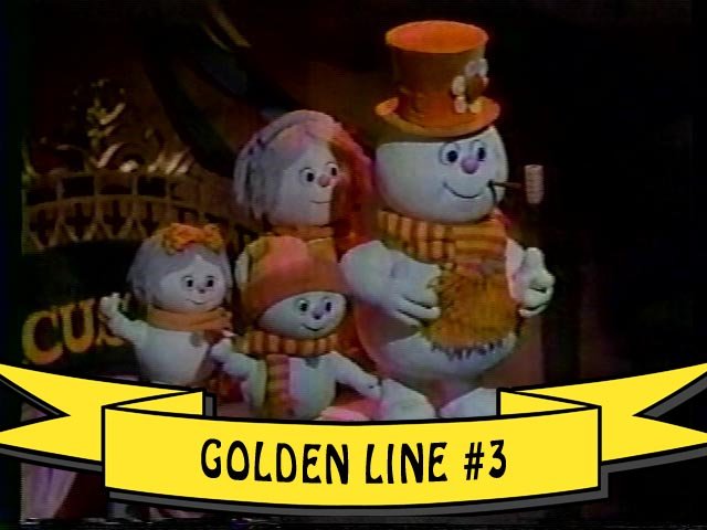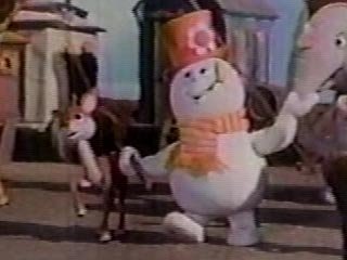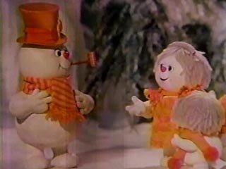 Better yet, if FROSTY appeared -- "Uh-uh, you know the problem with that! I'd be a REAL misfit walking around by the seashore on the Fourth of July! I'd melt in ten seconds!" By now, you've noticed the little snow midgets wandering around Frosty. They're actually the children he had with Crystal, the wife introduced in the dull 1976 cartoon Frosty's Winter Wonderland. For some reason, Frosty and Crystal think this is the perfect time to sing about their devotion to each other, though it doesn't apply to the situation in any form. "Everything