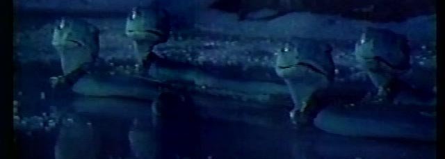 Now that Santa is out of the way, Winterbolt prepares his own trip arrangements. "What a wonderful sleigh the Snow Genie has prepared for me! Instead of rein-deer....I have rein-snakes!" Uhh....Winterbolt? I'm pretty sure the "genie" is trolling you right now. Those don't look like snakes to me, more like giant....let's just say "tadpoles." Frosty is already worried that something may have happened to Santa. Crystal says not to sweat it. Frosty remarks "Okay....but I have a feeling tonight's gonna be a real wet act! And I'm not talking about the seals!" Morbid much?