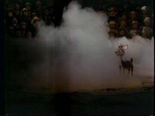 The circus has a capacity crowd, and Lorraine introduces tonight's acts, which fill a lot of time. Rudolph burns away the effects of a fog machine through his nose mojo. Frosty and his family perform acrobatics by sliding down a giant chute. Lanie walks a tightrope, then stands on top of a giant rotating Christmas tree as twenty dancers surround her, singing "Rockin' Around the Christmas Tree." (Isn't it July?) I don't know if its use in the special was intentional or just coincidence, but Johnny Marks wrote both "Rudolph the Red-Nosed Reindeer" and "Rockin' Around the Christmas Tree."
