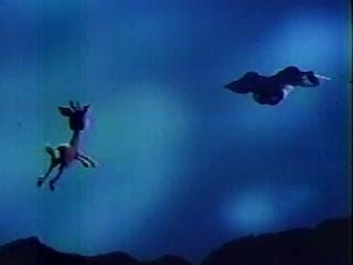 At first things look bad for Rudolph, but then he pulls the old "get two baddies to charge at you from opposite directions, then move right before they bash into each other and knock each other out" trick. That one never fails. "You don't frighten ME," laughs Winterbolt. "You want the hat? COME AND GET IT." Rudolph promptly does so. You should only taunt someone like this if you're confident you can withstand the blow from them. When Rudolph headbutts Winterbolt, he loses his grip on the hat and it flies through the air. Rudolph turns around and catches it -- and at that instant, because he was brave and all, his nose starts to glow again.