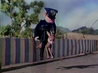 After Rudolph struts for the crowd, Scratcher gets his attention. "I've got an important job, Rudolph ol' pal, but I need help. Tonight's receipts are in a briefcase in this wagon, but it's so dark inside, I can't find out where. You have your own luminescence, so.....Do you think you could go inside and take care of this for me?" Rudolph does. Scratcher explains that he's to deliver the briefcase to the cop waiting on the corner, who will in turn deposit the money in the bank. It's actually Sam Spangles, and by giving him the briefcase, Rudolph has just doomed the circus. And by having to use the nose to find the briefcase, Rudolph has used it for evil, and it's lights out for him! Lorraine asks Rudolph where the money is. Rudolph doesn't know what she's talking about; "wasn't it Scratcher's job to take care of that?" Lorraine is insulted that Rudy would think she'd trust a roustabout only hired for two hours to handle something as critical as that. A rush of enlightenment hits Rudolph at last, in only the dorky way Rudolph can realize something. He goes walleyed, throws back his head and says "Ohhh, WOW!" This is heavy, man!