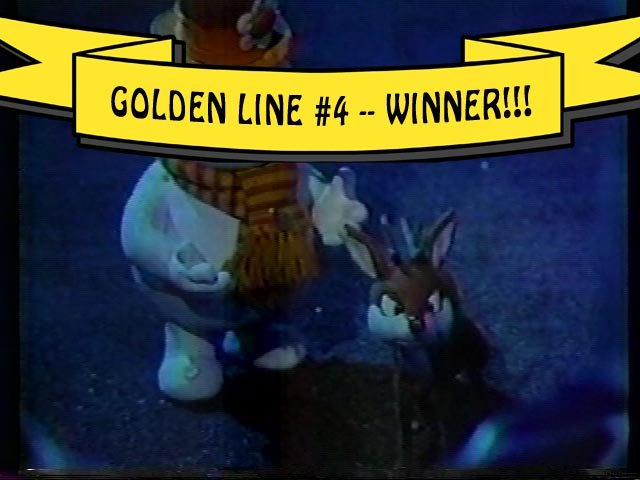 "NOOOO! I WILL NOT BE DEFEATED!!" Winterbolt vows as Rudolph flies away. Whatever he wants to do, he takes his sweet time doing it -- and so does Rudolph. The next scene occurs the following day. Everyone is still crying over the fate of Frosty when Rudolph finally, finally arrives, carrying on his back a policeman -- the real deal this time, you know so because he has an Irish accent. He and the cop found the real briefcase and the proof indicting Sam Spangles. Sam is arrested, Scratcher is banished back to the cave, Frosty gets his hat back ("Happy Birth-Day!") and everyone is being awfully cavalier considering the fact that Winterbolt could just cancel the amulets' effect at any time and melt the Snowmen. What does he have to lose anymore?