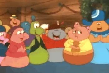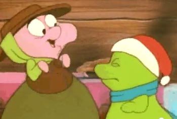 And I still think "Mirthworms" is a stupid name, but now that I recognize its origin I have a little more respect for it. This was the first cartoon created by Perennial Pictures in Indiana -- who eight years later would create the very first special ever covered on this site, the infamous Up on the Housetop. And once again (or for the first time, rather) nearly the entire thing is animated by one man...Jerry Reynolds, or G. Brian Reynolds as he goes by now. So needless to say, the two cartoons have a lot of similarities. The lead character, Bert Worm, has the same facial structure and portly build as Curtis Calhoun, and sounds like him as well, albeit much less whiny. If "mirth" means amusement, then this special should be pure comedy, correct? Why else would they be named MIRTH-worms?