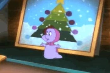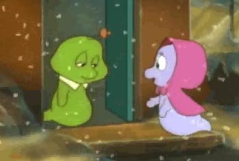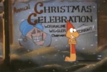 Bert manages to break a ton of dishes, topple the Christmas tree, and get paint everywhere in the span of two minutes. The stuck-up Wormaline loses her last nerve, hands him his hat and coat and orders him to leave immediately. Bert is crushed his first attempt at fitting in was so unsuccessful, and sings a morose song for three minutes alone in his house about how depressed he is. Crystal Crawler, Bert's next-door neighbor, finds it appalling Bert was given the bum's rush, and goes over to console him at his house. Unfortunately, while in the process of singing, Bert has already decided he doesn't belong in Wormingham and has written his goodbye note. Crystal tries several times to get him to come back, all the while implying heavily she has designs on him, but Bert misses all the cues. "Well, we don't have to go to the celebration at all then! We could have our own celebration right here!" She's practically throwing herself at you, Bert; are you deaf and blind? He refuses her again and says he needs to be left alone. "Well......okay......if that's what you want....." Crystal says sadly. Bert closes the door on her, packs up his things in a towel, posts his note to the front door, sniffles a little, and then leaves into the snow. BOY, THESE MIRTHWORMS ARE SURE FUNNY, RIGHT?? HAHAHAHA.....haha.....ha.........