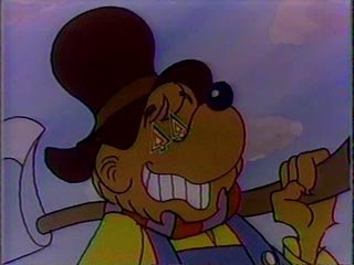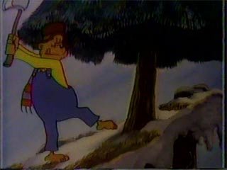 "No matter what, no matter where.....if it means going through the Panama Isthmus, if it means climbing to the top of Pike's Peak, I will find the right tree if it takes us a WEEK!" Papa declares. This line baffles me....they find the one word that rhymes with "Christmas" and they don't take the opportunity? Every time Papa sees what he thinks is the perfect tree, or every time he even thinks about trees (which is every thirty seconds), his eyes turn into tree-shaped light shows of red and green. They use this same animation clip over and over until it gets well past old. Papa sees a magnificent tree ("It's nooks had crannies! Its crannies had nooks!") and readies his axe in the chopping position....but just as he's about to take the first swing, Brother notices something unfortunate.