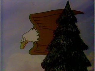 Papa finds another tree to go gaga over, and gets into position once again -- and guess what, the same thing happens, only with an eagle this time, which chases after him. Uh-oh, is this one of those stories? Are we going into a rut just for rut's sake?