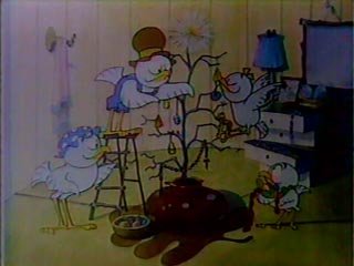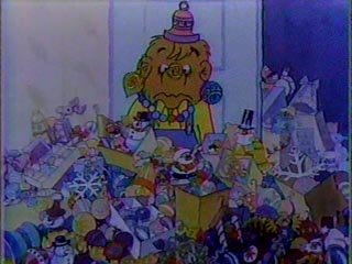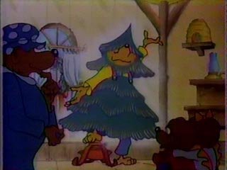 Yes, as thanks for sparing their own domiciles, the creatures of the forest have gathered together to turn the Bears' house into the greatest Christmas tree ever. And Mama must have let them in the house, because all their ornaments and decorations are on it too, including the wind-up bear and the gaudy star, which is suddenly outshone by the inexplicable reappearance of the Star of Bethlehem. The brightness of that star causes all the other bears to come out of their houses and witness the amazing decoration job, and they get so happy at the sight, they start singing about "Christmas Eve reminds us all to love all creatures great and small!" Over the top? A bit, but the way I'm describing it makes it sound more overblown than it really is. Why didn't it fit in? |