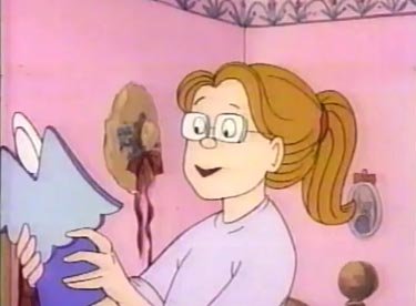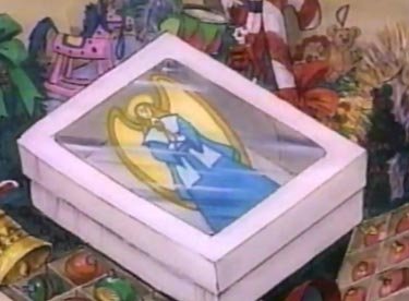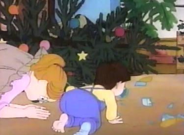 Not quite. Elly's angel suffers a different fate. No one else wants to help Lizzie decorate, and on top of everything else Elly saddles her with April and won't take no for an answer. While Liz is stringing the lights around the tree, April reaches for the package again and takes out the angel. Lizzie turns around just in time to see it fly through the air and smash into oblivion. "HOW COULD YOU, ELIZABETH?? HOW COULD YOU LET THE BABY AROUND THE TREE?" Well, gee -- you wouldn't listen to her, you wouldn't help her, and then you gave her the baby despite seeing what happened earlier -- you're lucky April isn't in pieces. This is hardly Lizzie's fault. Yet she gets treated like garbage in this cartoon, especially by her mother. Despite the fact that Elly's negligence is to blame, Liz vows to make it up to her by obtaining another angel somehow. Everyone must appease Lynn -- I mean, Elly at all times.