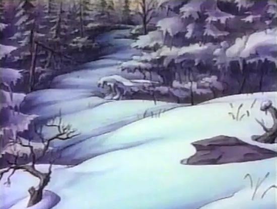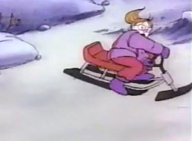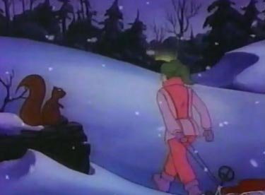 She blasts through a prickly briar patch, zooms through a log, spins in circles out of control, and much much more. In what may be a first for a cartoon character, she slides across a pond of thin ice and it only cracks and breaks AFTER she's reached the other side. This is the first lucky thing that's happened to her all day; maybe life is looking up? Maybe not, as she ends the ride by bashing into a tree and knocks herself out.
