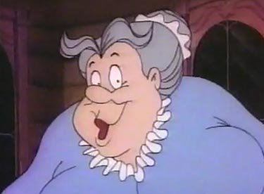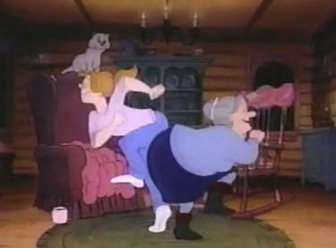 By the time she wakes up, darkness has fallen....and she got here so fast, she doesn't know where she is or what direction would lead to anyplace familiar. She's lost in the woods, and it's getting colder by the minute. Enough is enough; stop bagging on Lizzie, cartoon, or you're going to kill her. Fortunately, Liz finds a log cabin for shelter. An old lady with an Irish brogue already lives inside, but she's more than happy to invite Lizzie in and warm her up with some hot chocolate and/or a roaring fireplace. As for what happens inside the cabin, these next two screencaps speak more than any words can.....