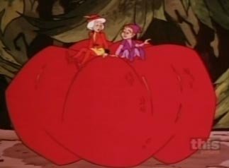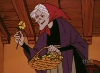 Once the water drains away, the pair are horrified to find that the annoying giants are all dead! What, this early? In the middle of the special? Bull-plops. They're so not, they're just lying there for...whatever reason they have. Once they get up, Snow White is thrilled and relieved, and they move on. The wicked queen is furious when her mirror still won't tell her she's the fairest. This calls for an ultimatum! "It is time Snow White and I met......face-to-face!" I guess that time when she met her face-to-face as a rat didn't count. The Stepmother's wholly original plan is to disguise as a giant old woman, knock on Snow's door, and offer her....no, not a poison apple, but a bouquet of flowers with poison pollen. That makes it a new idea!