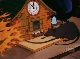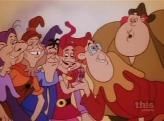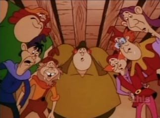 Well, Snow White falls for it, but I expected nothing greater. The giants are peeved at the Evil Stepmother and chase her up the mountain to her castle. Sounding familiar? Well, wait'll you see what E.S. has in store for the giants....once they reach her fortress, she instantly zaps up SEVEN GIANT DEMONS to DESTROY THEM! She learned from her past encounter with the Dwarfs! Take THIS, Dopey! So how do the giants get past the demons? They don't. The solution to this is the most head-bangingly stupid moment in the entire cartoon. I know that's saying a lot, but listen to this: the giant who saves the day is Hicker. And how does he? By getting really, really scared and hiccuping so loud and frequently that he causes an earthquake, making the Stepmother's castle topple into rubble. THAT'S the climactic payoff.