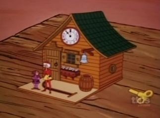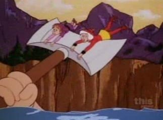 Snow White and Grunyon escape into the cuckoo clock, but then the Stepmother sets it on fire! Snow White, by the way, is incapable of doing anything when in trouble except hiding and cowering, so the giants have to constantly rescue her. Which they do here, for the first time of many. The giants conclude that maybe it would be safer for Snow and Grunyon to stay with them while they work. They're digging out the canal for a river. Once the snow melts in the summer, the water will travel down from the hills and fill it. Not soon enough for the Stepmother, who melts the mountain snow herself and causes an aqua avalanche. Snow and Grunyon are only spared by riding on Brawny's axe blade.