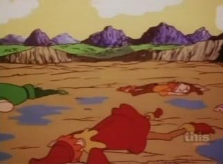 She wastes no time, rushing to her cauldron and whipping up a giant blizzard spell that puts the entire kingdom of Noel on permafrost. The cold wind blasts through the castle of the Snow Whiteseses, and Snow II runs into the throne room just in time to see, to her horror, her parents turning even whiter than snow! Thanks to her shameful sheltering, the Queen only has seconds to tell her daughter who the real culprit is. "You must run from here! You must find the seven dw--" Before she can finish her sentence, the Queen and her husband harden into ice sculptures! At first I thought people were just freezing in place, but Snow says later her parents have been "turned to ice" and acts like they're dead. So does the Mirror, who only counts the younger Snow when he tells the Stepmother she stil isn't the fairest one. Snow and Grunyon quickly improvise a makeshift sled from a wood plank and escape downhill from the Stepmother's wrath. Eventually they reach a different area entirely, but can't stop until they crash land into a tomato.