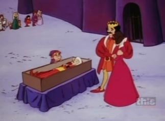 That takes care of nearly everything except Snow White. As was covered previously, only the kiss of true love can cure poison in Fairy Tale Land, and this special never introduced a love interest for Snow at any point! Her mother and father weep; is there no hope? Well, never mind -- looks like a peck on the eyeballs from her parents will work just as potently. NOW everything's solved! Except for this problem: Snow observes that "if the castle on the hill has been destroyed, I can't make my Royal Decree now!"