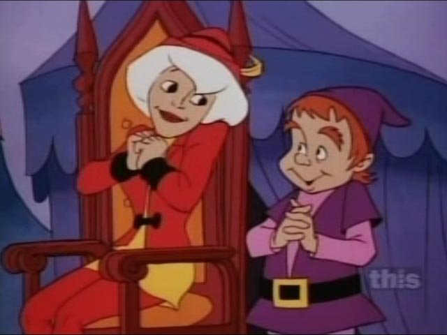 exactly like the Queen from He-Man. Aha! It's about fifteen years later, and this Snow White is the progeny of the original Snow White! I guess that makes the Queen Snow White like Cranky Kong or something. The queen tells her daughter that she is old enough to make the Royal Decree of Christmas this year. Sounds like a speech, right? In this cartoon, a Royal Decree is apparently something where you make up an idea and then everybody obeys you and makes that idea a reality. "I want to decree....that there be a special CHRISTMAS CASTLE where all the children of Noel can LAUGH and PLAY and HAVE FUUUUN!" "Where would this