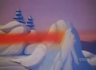 Everyone packs up the festival equipment and goes home, but leaves behind a.....thingy (looks like a diamond umbrella, if that makes sense). The setting sun overlaps the umbrella, which creates a magnifying heat beam that melts a large mound of snow covering an ice crystal, then the crystal itself, revealing a figure inside. As misfortune would have it....She's back, she's baaaad, and she's still determined to be the most beautiful woman in the world via killing everybody prettier than her.