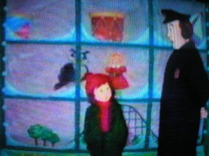 Ivy and the doll finally meet eyeball to eyeball, and if you can believe the writer went this far, a light beam from heaven shone onto the toy store to attract Ivy's attention. "Oh golly wolly, my super-special CHRISTMAS DOLL!! Now my life is complete!" Instead of censoring butt-cracks, I want the FCC to start cracking down on specials like this. There's an officer nearby that sees Ivy, shivering out there in the cold in front of the toy store. He's right there in the picture on the right. But he doesn't do anything about it, which is odd, because by COINCIDENCE, his wife has always wanted a little girl to raise as her own! If the ending to this brainless animation isn't clear to you by now, see a doctor.