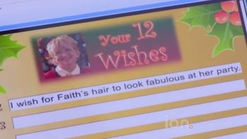 Her friend Faith complains about her plain hair. Laura whips out her reading glasses, cracks open her laptop and types "I wish for Faith's hair to look fabulous at her party." So far, her first two wishes have been for flowers and hair. I know Noel said to start small, but you can start wishing larger anytime now....