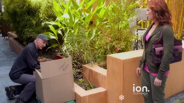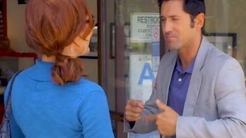 Remember the red herring boyfriend? Here's the obvious planted love interest you've been expecting. His name is Eddie, he also volunteers at the shelter, and in contrast to Morgan's tightly-starched suits, he wears casual buttoned-down T-shirts. If that wasn't enough of a clue, their dogs become best buddies while they were walking. As in the kind of best buddies that start licking each other all over. It must be destiny! He takes her out for lunch and Laura orders a Pumpkin Gingerbread Latte. They exchange vocational information. Eddie reveals he's an attorney and asks what Laura does for a living. She tells him "I'm unemployed at the moment, but I have a strange feeling my luck is changing for the better." When Laura returns to her apartment there's some guy in a tux loitering outside. He's looking to discuss a will with Mr. Harold Wayne. Harold Wayne is the name of the old electrician who's been waking Laura up at night with all his noise. "If I were you I wouldn't bother him -- he's a total creep! He doesn't have any friends, any family..." That makes him a total creep? Being alone makes him a creep? If you've already decided you hate Laura, you're a prescient one, because the movie hasn't even started getting into the worst of her.