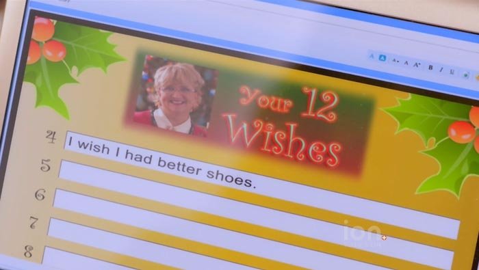 Now, if only she could get rid of that banging noise made by the neighbor next to her apartment. Laura whips out her cell phone and looks up Noel's mobile site. "I wish for the banging to stop." EARTHQUAKE! It stops. The next thing she knows, Mr. Wayne is getting kicked out of his apartment for rupturing a gas line. That's a pretty serious thing to do, and it was because Laura "wished for the banging to stop." This is on her head, but she doesn't seem to care. Next, she does something even worse. Laura walks inside and finds she's broken a stiletto heel. Oh NO, she wouldn't. Laura, there are people starving in Africa, don't you dare eye that computer screen. If you waste a wish on shoes, so help you, I'm gonna----