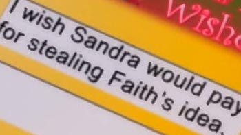 Faith still works at the fashion whatever, and the company is trying to win Dollberg's, a huge clothing store franchise, to its side. If she can't come up with a surefire plan to woo them, her job is toast! She tells Laura and Laura tells Website. "I wish Faith would have a winning idea." Laura isn't at the point in the movie where she has a moral revelation and changes her ways, so I have to ask: what's wrong with this wish? How is it selfish? It kinda sticks out. Call me insane, but I don't think they thought about logic too much in this script. Next day, two bigwigs are