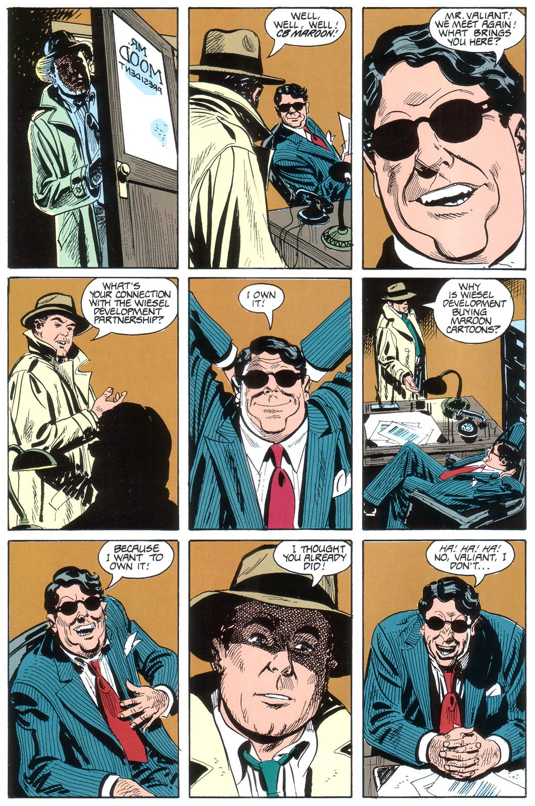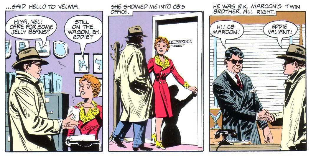 At this point, we check in on the aforementioned Mr. Valiant. He's still at his detective gig, but he's trying to wean himself off the bottle by popping a jelly bean every time he gets the urge. It's at this moment that he receives his next case, but it comes from an unexpected source: C.B. Maroon.