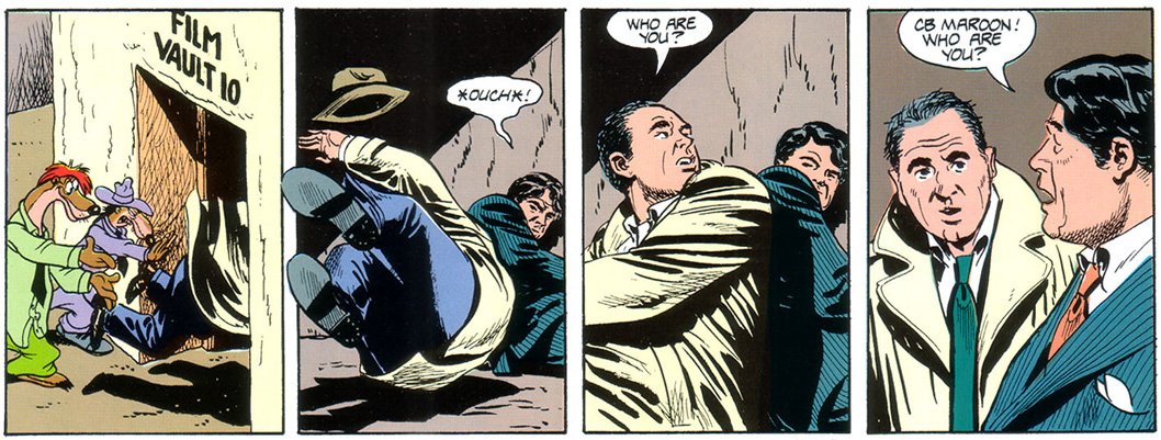 Roger runs back to Eddie and p-p-p-p-pleeeeads with him to find out what's really going on. Eddie thinks this C.B. character is starting to sound awfully odd, so he sifts through newspapers to track the man's behavior over the last two weeks. Most recently, C.B. has fired not only Roger but the majority of Maroon Cartoons' stars. And he's about to hold a press conference the next day, where it's believed he's announcing the studio will be sold.