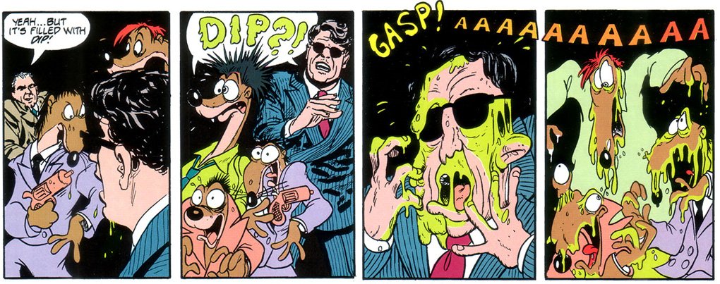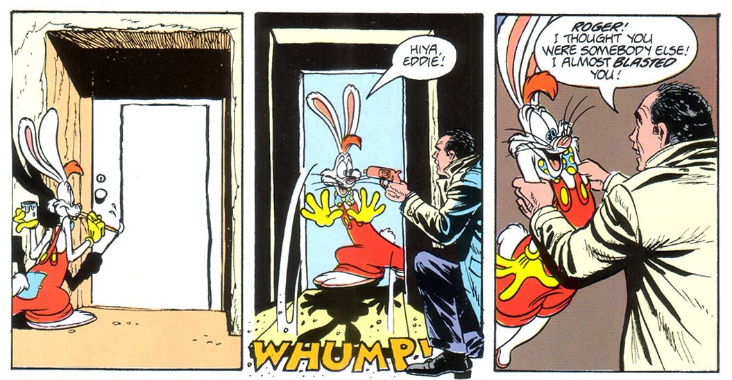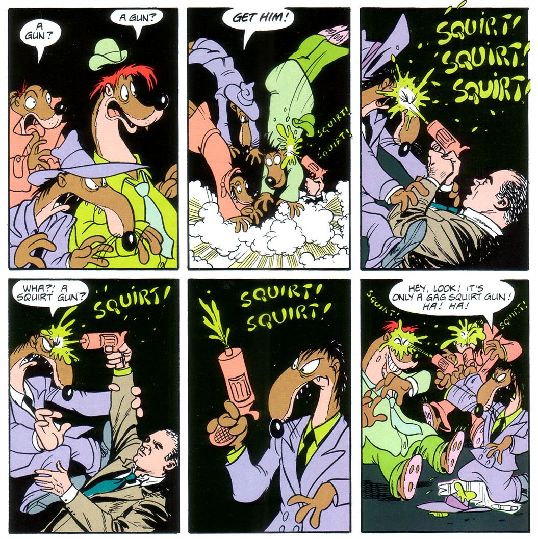Or perhaps there's more. If you want to get technical, the entire eighteen-issue Roger Rabbit comic book released by Disney themselves in 1990 takes place after the movie, so that amounts to nineteen sequels when the preceding comic is factored in. It's a bit different though. Since Disney didn't feel like paying for the rights to Bob Hoskins' face beyond one issue, Roger's PI partner is not Eddie Valiant, but a legally safe copy named Rick Flint. There is also, like here, a frequent use of squirt guns filled with Dip as anti-toon weapons: