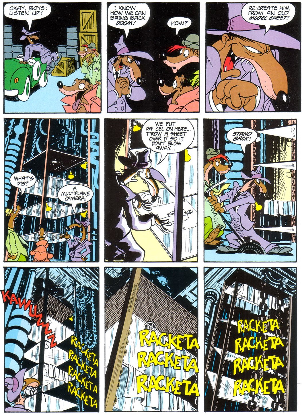 That's correct....to bring Doom back to life, they simply have to re-photograph him on film. There's a multiplane camera at Von Rotten Manor, and after rigging up a new cel of Doom, they dramatically throw some switches and parody the familiar scene from "Frankenstein." As expected, it ends with one of the Weasels declaring "HE'S ALIVE!" -- but only while Doom's arm is choking him.