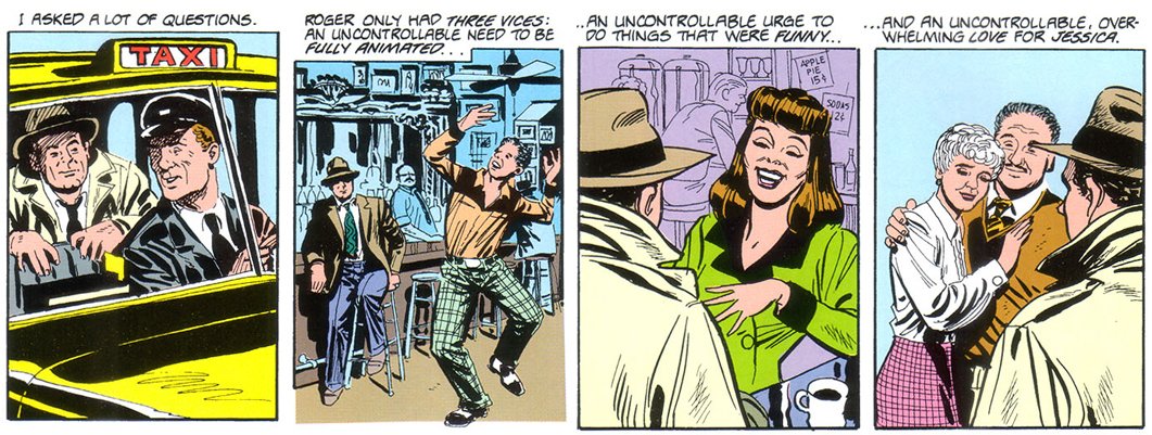 The studio has been temporarily shut down ever since Maroon left, and his brother wants to start it up again "with some small projects at first." But first, he wants to know more about the toons he'll be in charge of, especially Roger Rabbit. Well, Eddie had quite an adventure with Roger, so he tells C.B. all about it --------- actually, C.B. hires Eddie to simply walk around and interview people who have interacted with Roger in the past. The job costs $500, a lot in late-forties money. What a waste. If this is C.B. handles his company's finances, Maroon Cartoons will be bankrupt in a week.