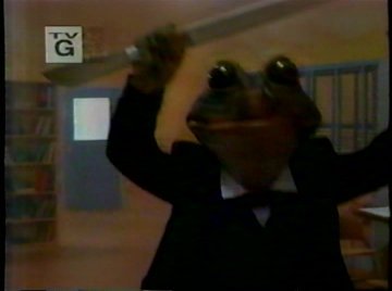 Wayne arrives just in time and socks the frog in the jaw while exclaiming "Take THAT, you tap-dancing freak!" The frog never tap-danced once; is this a Michigan J. Frog reference, or what?