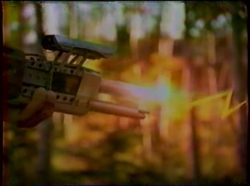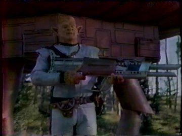 "Ha ha, you think this is a weapon? Fear not, tiny brains! THIS is a weapon!" He brings out a gigantic laser rifle and blasts a nearby bush (it makes little cartoony lightning bolts; great special effects). The bad guys start salivating over his equipment. With that space tech, they could own the nearby town easily! So they start approaching him slowly. I mean slow enough that he could easily shoot them with the big thing he's carrying. But instead he stands there holding it and says things like "Uh, you might want to go the other direction...uh, I don't like the look you're giving me." Who's got the tiny brains?