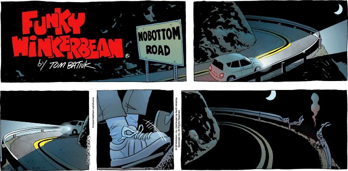 This is the biggest, most blatant example I can think of for a series title that eventually had a complete disassociation with its own tone. Initially sold as a gag strip with the wackiest name the 1970s could produce, it completely changed to a dark, weepy drama sometime in the 90s and never switched back. You'd open the funnies, and there'd be multiple panels of a car accident, or some lonely man dying in the rain, or someone who just croaked from a horrible disease, and...Funky Winkerbean seems like the last thing you'd want to call that, but maybe it's just me. The strip shut down production recently, but its surviving characrers were moved to Tom Batiuk's other strip, Crankshaft -- a more fitting name, as the universe he created is pretty darn cranky.