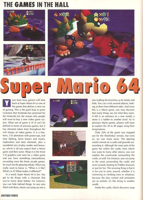 One lazy morning at school, I was handed a copy of Nintendo Power Volume 80 -- and, through its pages, was formally introduced to the Nintendo (Ultra) 64 and 3D gaming in general. The console wouldn't be out for another nine months, but its screenshots looked like nothing I'd ever seen before. Up to that point, just about all games were set on a 2D plane. Being able to freely walk around a 3D world was a new novelty. The Saturn could barely do it, but it didn't look good. The Playstation could do it somewhat better, but nobody was paying attention to the Playstation this early. The most immersive 3D experience you could have was Doom on the PC, and that amounted to walking around a maze while demon sprites harrassed you -- hardly the free roaming Super Mario 64 was promising.