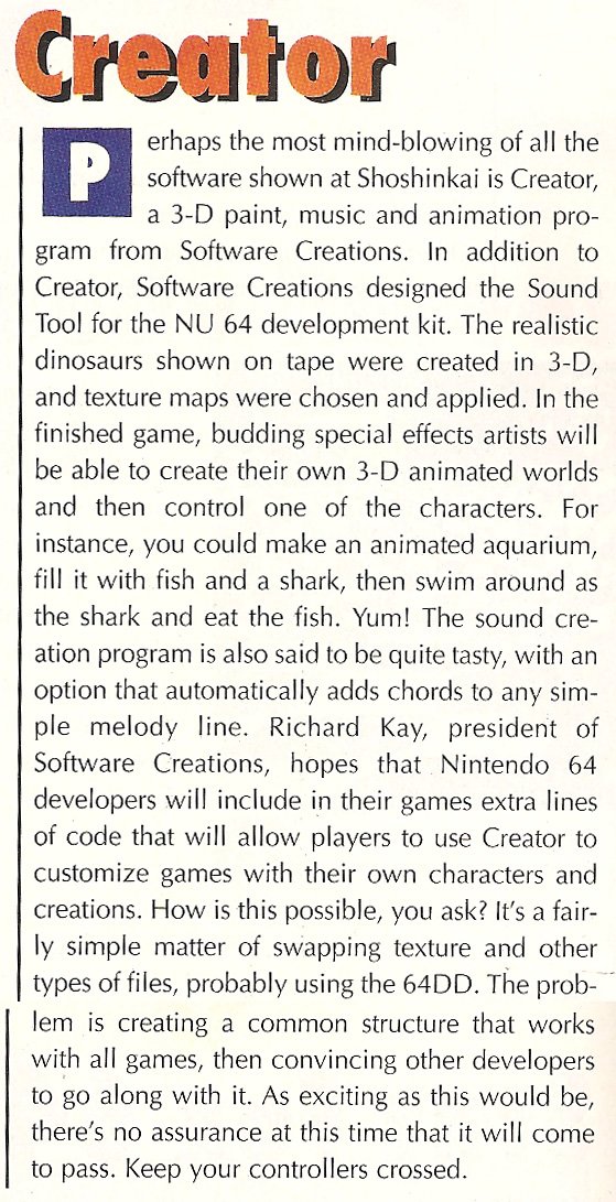 I wanted to play Creator most of all. I wanted to make a shark and become it! But this game-making game, which promised to give you the power to create entire 3D worlds, was never released as described. A reduced-scope version of it called Mario Artist came out for the Japanese 64DD, but of course that entire add-on bombed in its home region, so we never got our own copies.