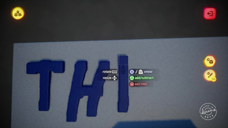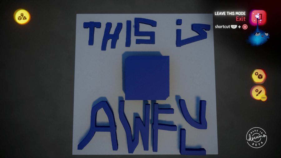 While Dreams is easy to start, you won't master it in a day. The software is pretty darn powerful, but it doesn't reveal all its cards at once for fear of overwhelming you. You MUST start with the tutorials, and new options only become available when you've proven your skill with the ones you have. In the beginning, Dreams simply plops you into a sparse nothing-world and teaches you the basics: how to select, how to lift, how to stamp, and how to take control of avatars and explore. Find everything in the area and you're granted access to the main menu.