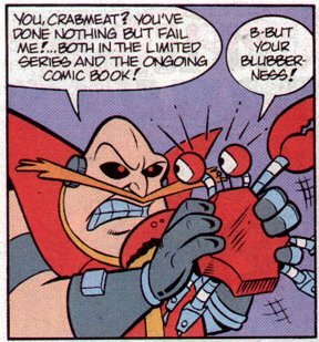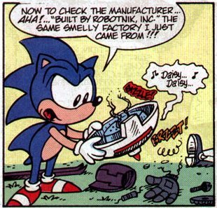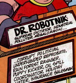 According to this comic, Dr. Robotnik was once Dr. Kintobor ("Robotnik" backwards), a kindly scientist who aimed to rid Planet Mobius of evil by inventing a giant evil-sucking machine powered by the Chaos Emeralds. And Sonic was originally brown, like a proper hedgehog, but turned blue after he broke the sound barrier (on a treadmill). Sonic met Dr. Kintobor and prepared him a lunch consisting of one hard-boiled egg and a bottle of soda pop. But then Sonic spilled the soda onto the machine by accident and it broke and the evil escaped and went into Kintobor as he was holding the egg. He became Robotnik and immediately growled "I MUST DESTROY YOU....YOU WALKING PINCUSHION!!" The machine's inner workings were made of the golden rings, which were now scattered all over Mobius, and so your real goal in picking all those up was to rebuild the machine and turn Robotnik back into Kintobor. It was also implied that, by holding the egg as he got zapped, Robotnik had turned into an ACTUAL egg.