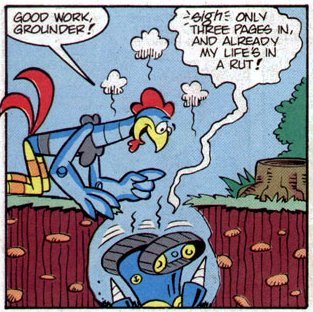 In addition to "Alf" Gallagher singlehandedly wrote half of Marvel's Star Comics line, and several of his trademarks became apparent--things that are repeated in Sonic. For instance, whenever a robot is destroyed in a Gallagher story, it has to sing "Daisy" a la Hal in 2001. Also, whenever there is a list of horrible things a man has done, that list must include "Insurance Salesman." Gallagher also loved using alternate spellings of popular comic sound effects: under his pencil "Click" became "Clique," "Crank" became "Cranq," and "Zoom" became "Zum" with a line above the "U" to indicate the long vowel sound.