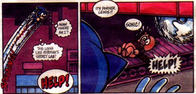 A character with the derivative name of "Porker Lewis," who apparently could lose, appeared in the promotional comic. There was no pig in the game, but there was one in the first-released drawings of a proposed Sonic TV series. This leads me to believe (though theoretically) that Sonic cartoons were in pre-production before the first game was ever released.