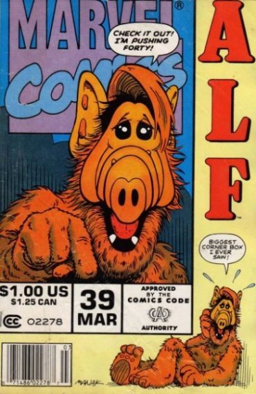 Gallagher also wrote the gags for the front covers, and he was writing the front-cover material for several issues of Sonic after he had stopped writing the interior. Another Gallagher Trademark™ was his love for corner boxes--those things comics used to use as quick identifiers when they were all squashed together on rotating drugstore racks. Normally the corner box was a static image of the comic's main character that stayed the same in every issue, but Gallagher created a different box for every issue of any cover he worked on. For Alf #39 he created the biggest corner box in comic book history, just because he could.