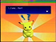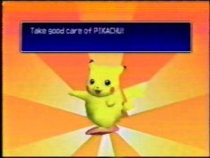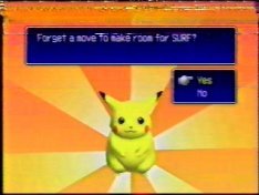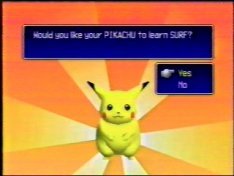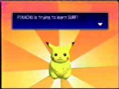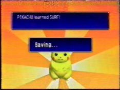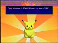 "Surf" isn't that bad a move to have on a Pikachu, really. It's a strong attack and it's the opposite in element from any other attack Pikachu can use, so it comes in handy. In addition to this, if you use the move to cross a river, you get a sprite of Pikachu surfing...and if you take Pikachu to a house by the beach in the normal game, it unlocks a surfing minigame. So, there were merits to going through all this hassle(and it was a lot). The reward screen only appears once...and so now this site has the only photos of it. Now, once again, YOU don't have to do it, and here's another reason not to: the truth is, if I had waited a year until I bought the Gameshark, I could have just hacked a Surf into a Pikachu and gotten all that stuff without wasting hours and hours of my life. But I did it, I can't un-do it, and I might as well get something out of it by showing you something you'd otherwise never see.