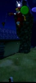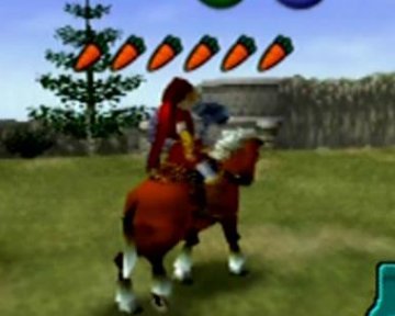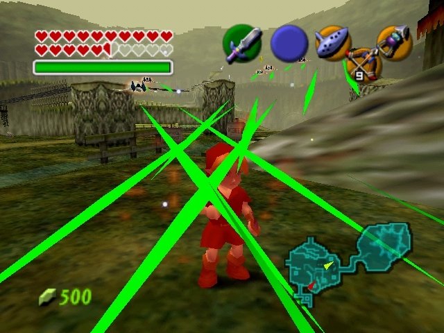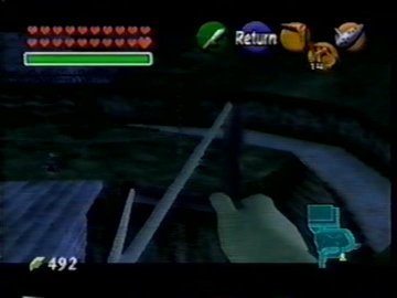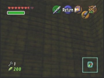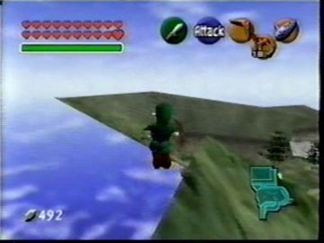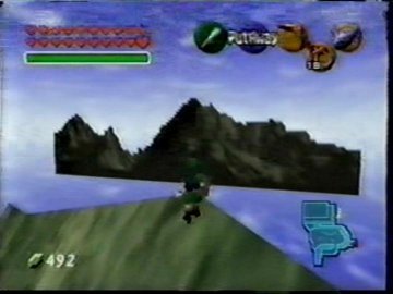 horse, against Miyamoto's will. This provides no real game advantages since there are no major battles Link has to fight on Epona in this game. And some of the items just turn out useless, like the Megaton Hammer--it merely appears and can't be used. BUT, the glitch activates all sorts of wacky effects! |