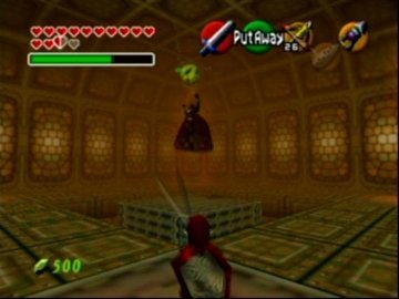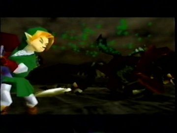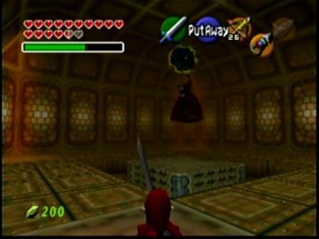 The original OoT release also contained a pretty large glitch--the famous Swordless Link Trick. When the final battle begins and you face Ganon, he knocks your Master Sword away and you must use a different item to hit him. Right after he does this in the gold version, simply save your game and reset. You'll be back in the Temple of Time, but with no sword equipped.