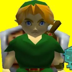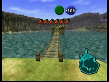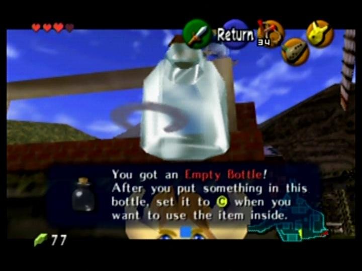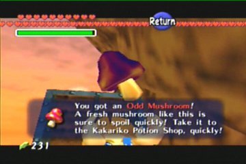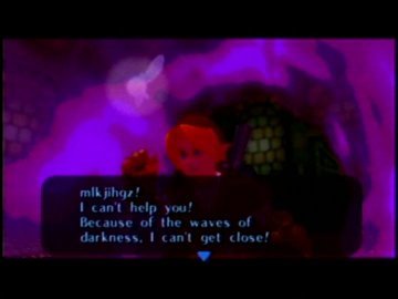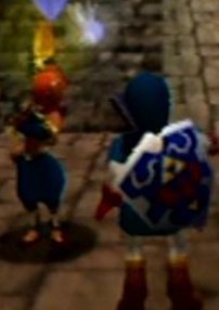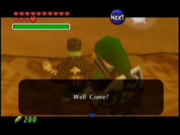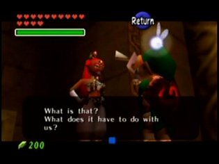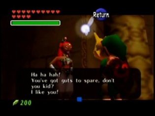 are you looking at? (Since when does Navi not know what something is? Where could she have said that?) WHAAAT!? Look at all those flags! Can you figure out which ones are real? (The only place in the game where flags play a role is in the Haunted Wasteland, and there is no illusory game there; the Poe leads you through the desert.) Hi! I'm a talking door! (The most bizarre thing in the dump. A talking door??) This door is currently being refurbished. (Don't know what that means.....ever seen it?) Hoot hoot! Link, you look like you're getting more comfortable in your role as adventurer. I think Princess Zelda is waiting for you to visit her again. You already have the Goron's Ruby, don't you? (You don't have to visit Zelda twice, and Kaepora Gaebora never mentioned Goron's Ruby specifically in the game.) I have you now! |