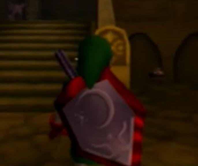 Before you is Link's new shield, with a symbol on it that safely means nothing. People have wondered where it came from, and I first assumed it was made up on the fly, but it has appeared before in the series....inside the Pirate's Fortress in Majora's Mask, and on General Onox's armor in the Zelda Game Boy Color game "Oracle of Seasons."