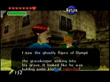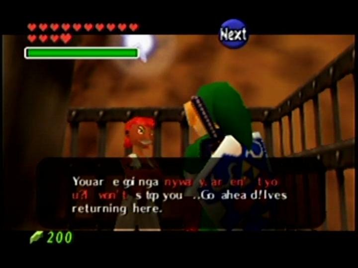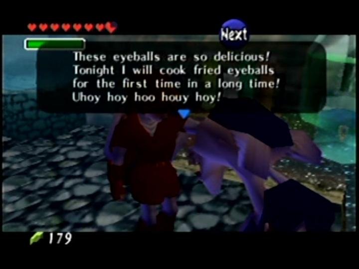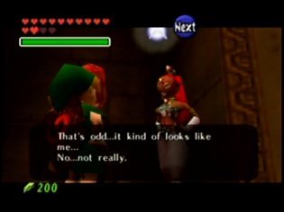 revived... Was it you who saved me? Don't be so nervous! I will give you a Zora Tunic as a token of my thanks. If you have this, you can... What?! You already have one? You're ready for anything, aren't you! With my heartfelt thanks...how about a KISS?! What? You don't want it?! Oh well... If you don't want my rewards, you can listen to my troubles... (Apparently King Zora will say this if you already have a tunic when you melt the red ice he's in. Sounds like it'd be worth the money...) Heh heh. You're already in the middle of something, aren't you. If you want to challenge me, you have to come here with a clear mind. No other distractions! (The Running Man will say this if you come to him with a timer already counting down on something else, like several of the Biggoron Sword trade items.) Her most precious possession? You don't know what she's talking about, but you've collected two Spiritual Stones! Only one to go! (There's a way to finish Jabu-Jabu before Dodongo's Cavern? I guess I never thought about it....) GYAAAH! You killed me!! Huh? Oh, it's you. Did you try to play the Sun's Song? Like I told you before, with that song, you can turn day to night or night to day whenever you want. When you're in darkness, that song should bring the sun's light to you. You should try it. (The ghosts talk after you find the Sun's Song? I figured they wouldn't appear again....) You can also show all your masks to Naborru during the brief time after you talk to her but before you acquire the Silver Gauntlets. How's that for detail?