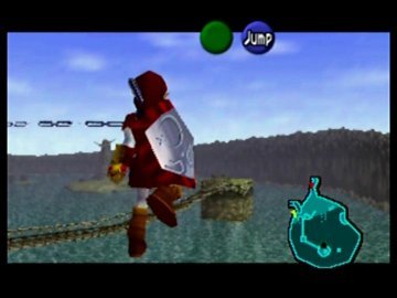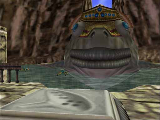one goal: to find the Triforce. Most of them have given up finding the Triforce now, though there are still idiots who believe it's there. The hackers are still hunting away, and if you can believe it, they're still finding objects in the game that weren't used. One of the earlier findings was an alternate version of the Jabu-Jabu area. The whale is further out in the lake, there are Tektites added to the water, and there's this mysterious Ocarina platform where you would normally put the fish. |