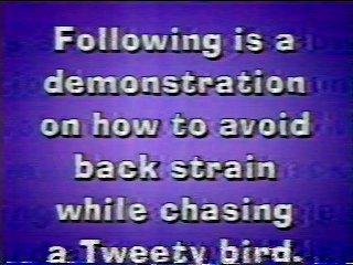 "The following is a demonstration on how to avoid back strain while chasing a Tweety Bird. Plant both feet firmly! Bend at the knees, not at the waist. And make sure the Tweety you're after is NOT a professional wrestler." LUCHAAAAAAAAAAAA!!!!